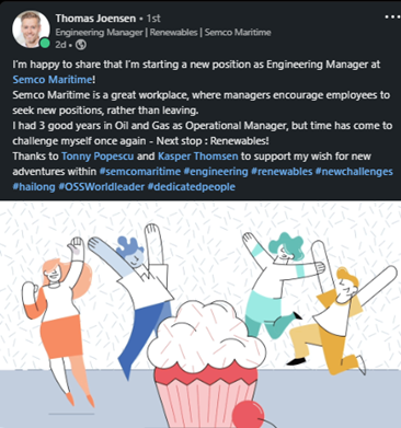 It makes us proud to see Thomas’ post on LinkedIn – because this is another perfect example of how we should support each other and encourage development within Semco Maritime!